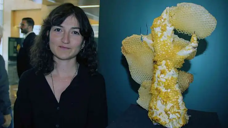 Dedesi ve babasının da geçimini arıcılıktan sağladığını belirten Araştırma Görevlisi Beyza Durhan, “Eserlerden en önemlilerinden birisi Yılanlı Tanrıça. Bu figürü doğal malzeme ile sarıp arı kovanına yerleştirdim. Altında böyle detayların olmamasına rağmen arılar kendileri bambaşka bir eser üretmiş oldular. Arılar ile işbirliği içinde böyle bir eser ortaya çıktı. Eserin ortaya çıkması süresi çok uzun değil. Çünkü doğru mevsimde doğru floralarla çok kısa sürede kabartabiliyor. Burada görülen bütün yüzeyler arılar tarafından örüldü. Sadece iç iskeleti bana ait” dedi.