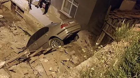 Kütahya'nın Tavşanlı ilçesinde bir otomobil yaklaşık 10 metreden uçarak bir evin önüne düştü.